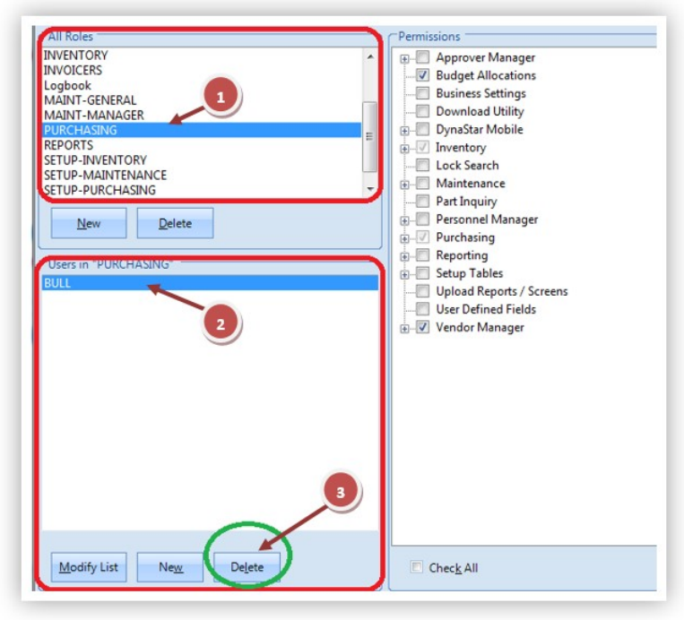 5. Click the Delete button at the bottom of the Users in "role name" area.