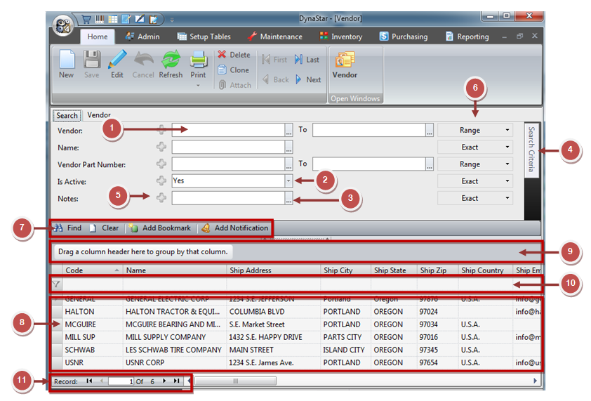 Every Manager in DynaStar™ opens up with a Search Tab. The search tab allows for finding the data in that particular manager. The diagram below shows an example of the Vendor Search Tab and the options available on the screen.
