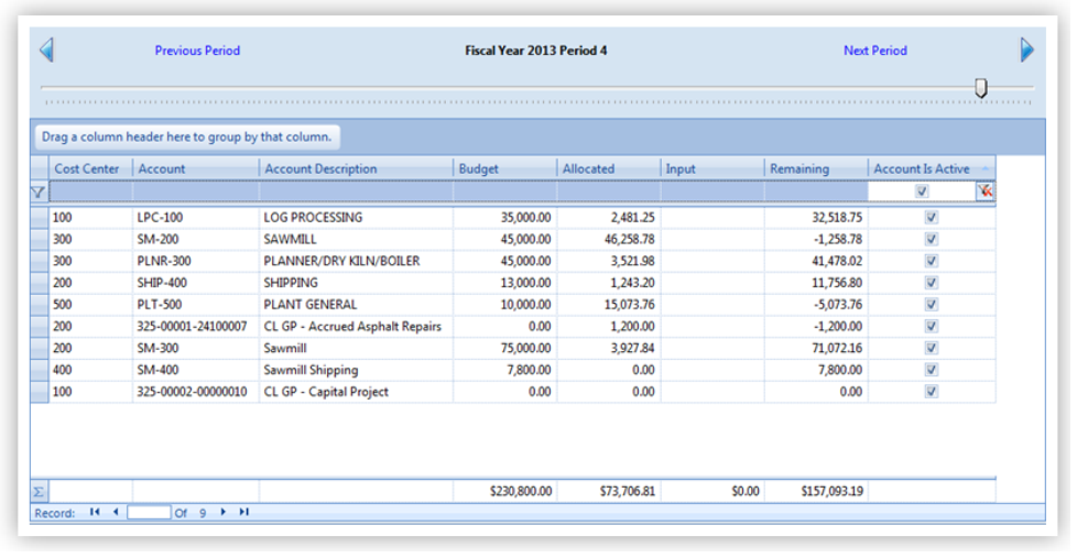 The Budget Allocation Screen, displays for each account in the system, for the current period displayed: