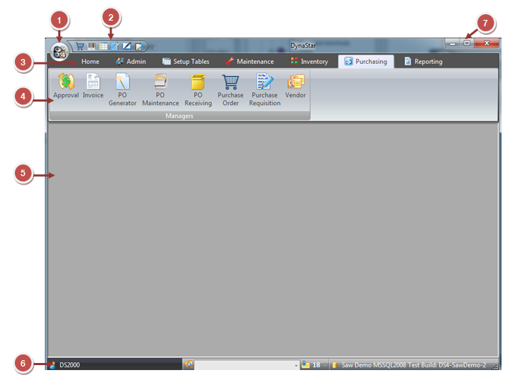 The DynaStar™ main screen uses interface items that are common to Microsoft® Windows® programs. See the screen shot below.
