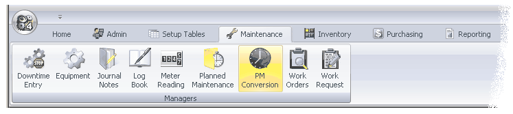 Below the Maintenance Module (Tab) is highlighted displaying the Maintenance Module's Managers available. The Home tab contains the toolbar commands used by all Managers.