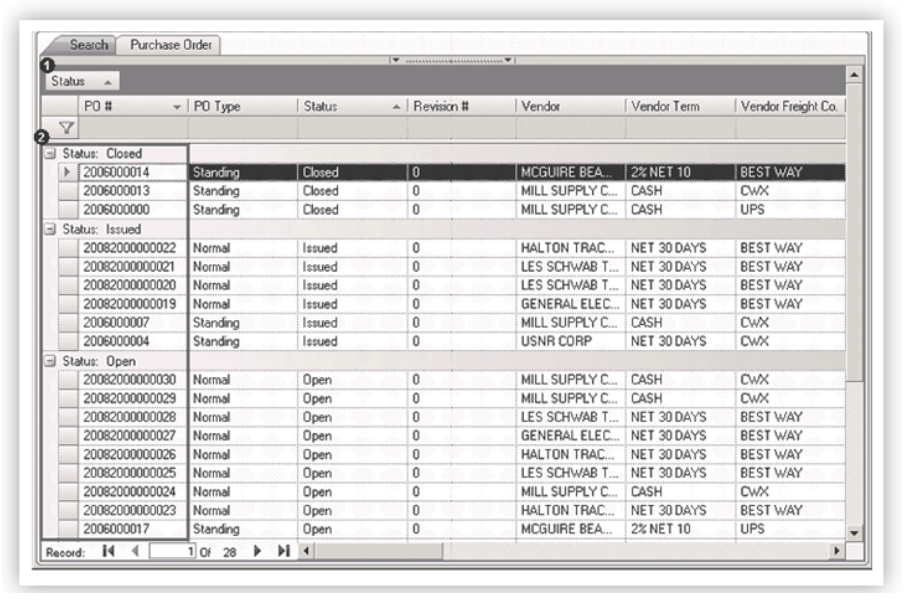 DynaStar™ grids that have a column grouping area above the column headers, allowing the user to group the grid by one or more column headers. DynaStar™ stores each grid setting on a user-by-user basis. How one user groups their grids, does not affect another user. Each user has their own grid preferences for each grid in the application.