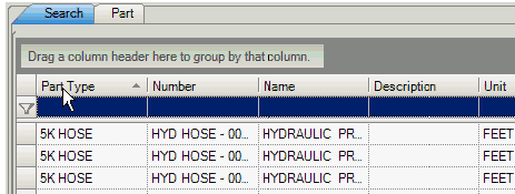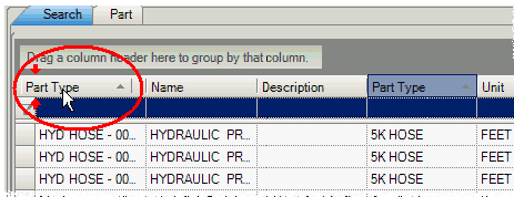 Two Red arrows will appear to indicate where the column is being moved to. In the example below the Part Type column (4th column from the left on the grid) has been dragged to the left of the grid.