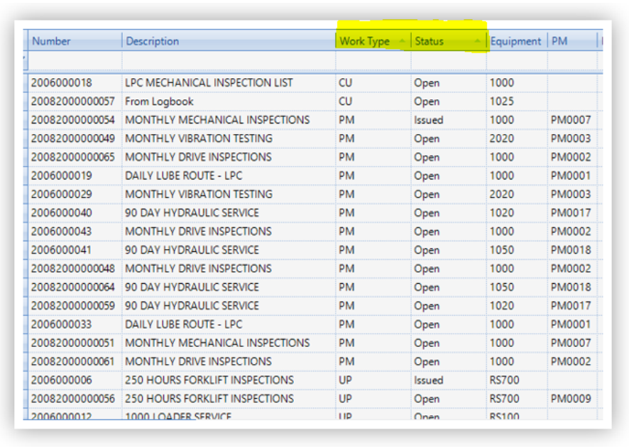 The example below shows that the grid is sorted by Work Type, then Status and both are sorting in ascending order. Notice how the items in the Status column are sorted alphabetically for each alphabetical grouping in the Work Type column.