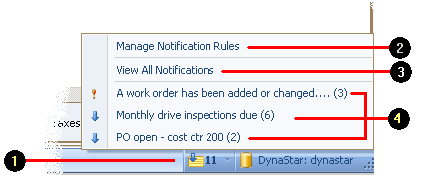 Located on the status bar to the bottom right of the DynaStar™ Application, the Notification menu gives a user access to their unread notifications, all their notifications not deleted, and to notification rules that the user has created.