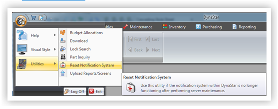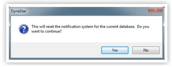 This utility is available to DynaStar™ Administrators only. It allows an Administrator to quickly and easily stop and restart the Notification System. The Notification System may get turned off or need to be restarted after IT performs updates or maintenance on the server that DynaStar™ resides on.