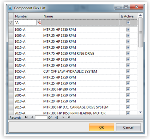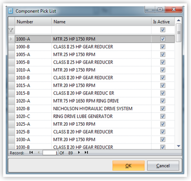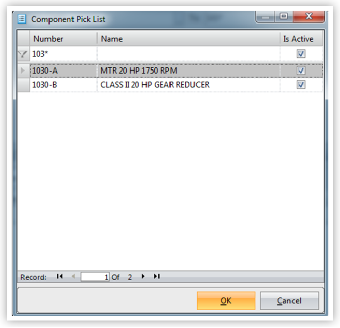 When the Pick List opens on the screen, the filter row will automatically contain the characters typed into the field and will automatically apply the filter to the results list. In the example below the grid has been pre-filtered to only those rows starting with the characters 103. By default most Pick Lists will automatically filter the results to only active records, indicated by the check in the Active column of the filter row.