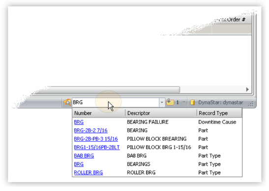 Located on the status bar to the bottom right of the DynaStar™ Application, this utility allows searching for records across the entire database, and goes to that record with a single click. Simply start typing 3 characters or more into the SMART SEARCH field and a contains search will be done bringing up links to related data.