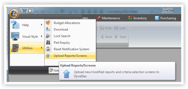 With the assigned privilege in the Security Manager, a user can upload reports (in .rpt format) or criteria screens (in .spec format) to DynaStar™ from their computer. All DynaStar™ reports are uploaded and stored within the DynaStar™ database. Once a report or a criteria/spec screen has been uploaded the report / spec screen are available to all users.